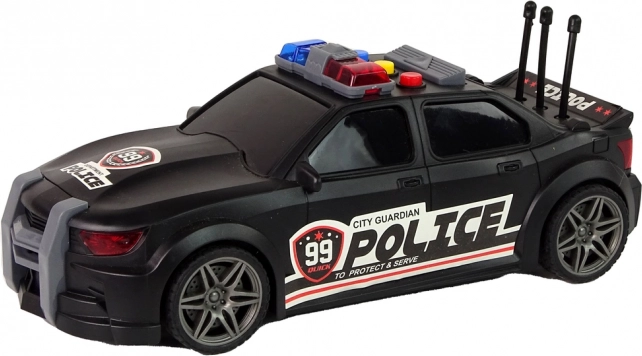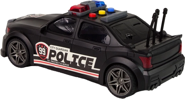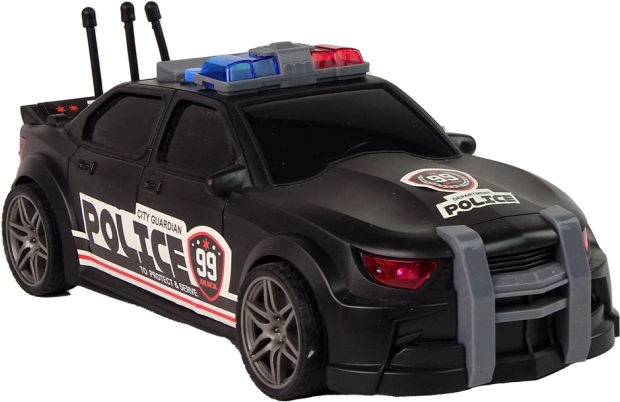 Zwarte sportieve uitvoering met POLICE-opdruk, blauw-rode zwaailichten en antennes geeft het speelgoed een realistische uitstraling.