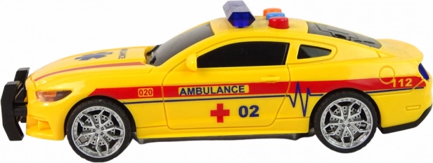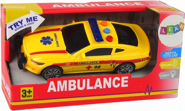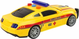 De snelle en robuuste gele ambulance met opvallende “Ambulance”-opdrukken brengt kinderen midden in de actie. Bij het indrukken van de knoppen gaan blauwe LED’s boven de cabine branden en klinken realistische geluiden – motorstart, claxon en waarschuwingssirenes. Dankzij de vliegwielaandrijving hoef je alleen te duwen, naar achteren te trekken en het voertuig schiet vanzelf vooruit.