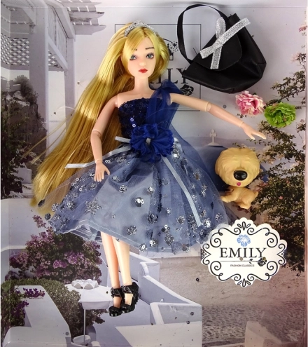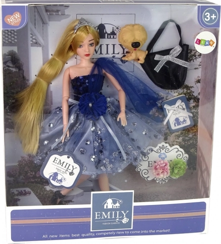 Ontdek de elegante charme van pop Emily – haar lange blonde haar, glinsterende blauwe jurk met bloemdetails en stijlvolle schoenen maken haar tot een geweldige metgezel voor dagelijks spelen. De set wordt compleet gemaakt door een schattig hondje, een zwarte handtas met zilveren strik en decoratieve bloemen voor originele modescènes.