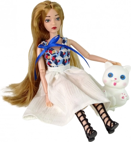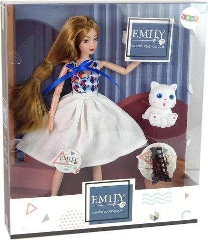 Schattige pop EMILY met een wit katje voor uren creatieve speelpret. Ze heeft lang haar, een stijlvolle outfit met een witte rok en bewegende ledematen voor gemakkelijk poseren. In de verpakking vind je ook verwisselbare schoenen, zodat je de stijl naar wens kunt veranderen. Ideaal cadeau voor kinderen vanaf 3 jaar.
