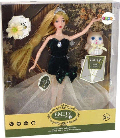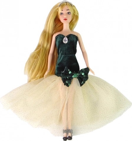 Pop Emily betovert met haar elegante uitstraling: het bovendeel van de jurk in een donkergroene tint, de rijk uitlopende tule rok met glans en paillettenaccenten geven de hele styling een bijzondere charme. Zwarte schoentjes met een versierde roos maken de outfit compleet, ideaal zowel om mee te spelen als voor in een kindersouvenircollectie.