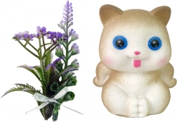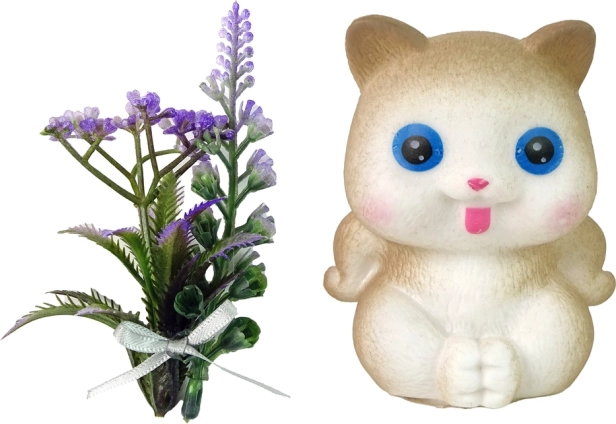 De set bevat een klein katje en een boeket paarse bloemen – ideaal voor het bedenken van verhalen en het versieren van de speelwereld.