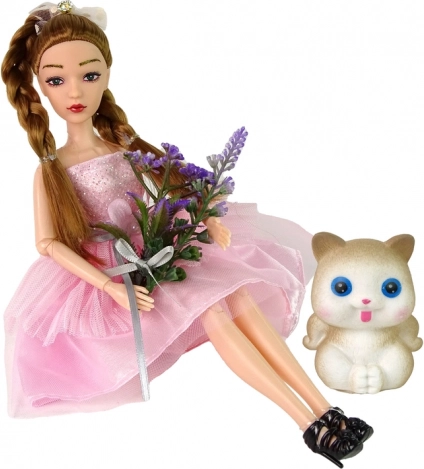In de verpakking zit een schattig katje en een bundel paarse bloemen, die kinderen inspireren om scènes te creëren en de fantasie te prikkelen. De hoogwaardige afwerking van duurzaam kunststof en de stoffen jurk zorgen voor een lange levensduur van het speelgoed. De pop is mooi als cadeau verpakt en klaar om plezier te brengen.