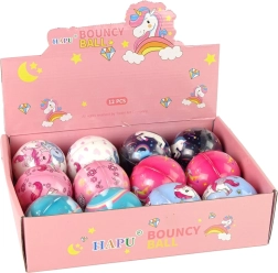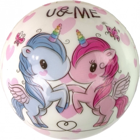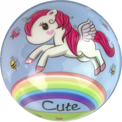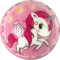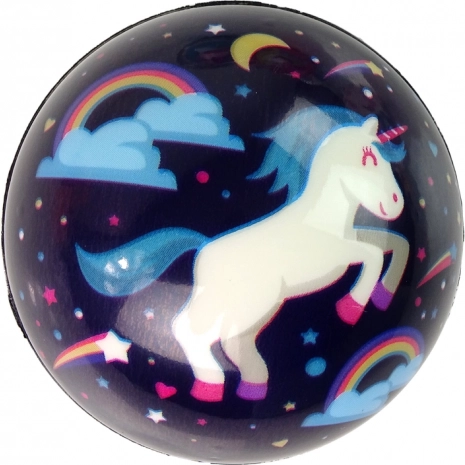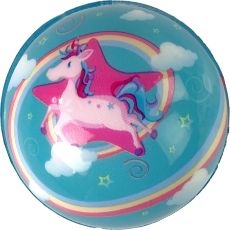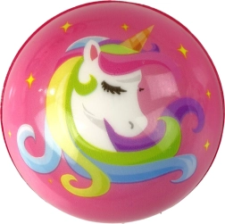 De bal is verkrijgbaar met een eenhoornmotief in verschillende kleuren, zoals lichtroze, donkerroze, zwart, wit, blauw en turquoise. In de verpakking zit één speelgoedbal met een diameter van 8 cm; reken 1–2 cm extra voor de verpakking.