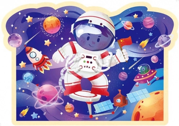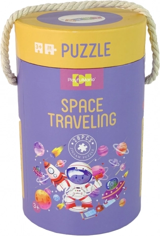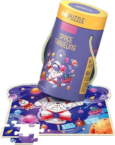 De illustraties tonen een klein astronautje in een omgeving vol planeten, raketten en satellieten, die het kind meenemen op een kleurrijk en gedetailleerd ruimtelijk avontuur. De verpakking in een handige ronde buis maakt eenvoudig meenemen en opbergen mogelijk, ideaal voor thuis en onderweg.