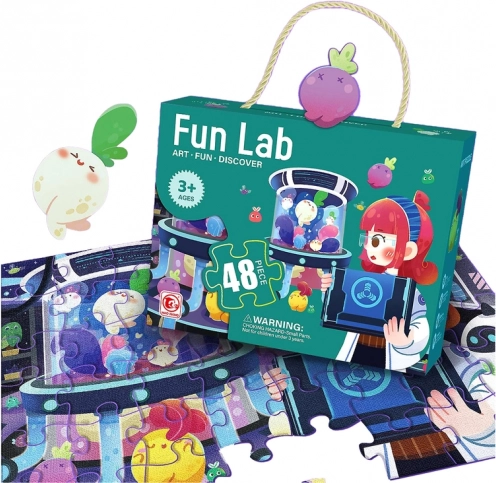 Leuke kinderpuzzel met een laboratoriummotief en dieren met 48 stukjes die de verbeelding, het geduld en de fijne motoriek ontwikkelen. De stukjes zijn groot (ca. 9 x 7 cm) en eenvoudig te leggen; de voltooide afbeelding is 50 x 34 cm. Kwalitatieve afwerking voor herhaald gebruik, geschikt vanaf 3 jaar, voldoet aan EN 71.