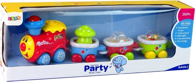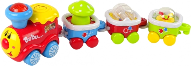 De locomotief speelt vrolijke melodieën, maakt rijgeluiden en de schoorsteen knippert in kleuren – ideaal voor de ontwikkeling van gehoor en aandacht.