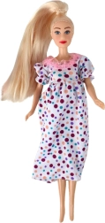 Pop Lucy is een prachtig uitgewerkte speelgoedpop met lang, glanzend blond haar dat kan worden gekamd en gestyled. Het subtiel geschilderde gezicht geeft de pop een realistische uitstraling, wat haar charme nog versterkt. Ze draagt een witte zwangerschapsjurk met kleurrijke stippen.