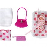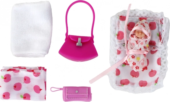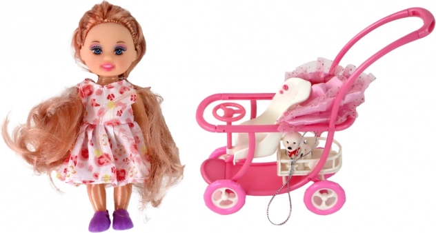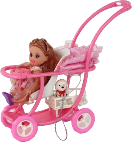 De set omvat een roze kinderwagen met een kleine pluchen hond, een perfecte aanvulling voor wandelingen en het naspelen van scènes. Het kleine popje is ideaal voor rollenspellen rond ouderlijke zorg of vriendschap. In de set vind je ook een baby in een dekentje, wat de fantasie verdiept en kinderen helpt empathie en zorg te ontwikkelen.