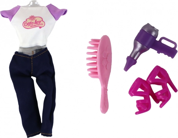 Ook inbegrepen is een verwisselbare outfit voor de grote pop, wat zorgt voor meer variatie en styling van Lucy. Daarnaast zijn er kleine accessoires zoals een handtas, föhn, kam en handdoek, die het spel realistischer maken en de creativiteit van kinderen stimuleren.