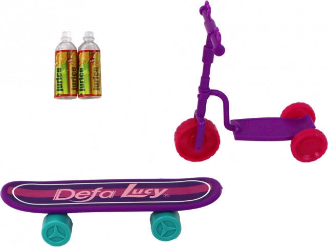 De set bevat ook een step en een skateboard, die mogelijkheden bieden om de wereld op wieltjes te verkennen, skills op ramps te oefenen, aan races deel te nemen of gewoon te genieten van bewegen in de buitenlucht. Twee kleine drinkflesjes voegen een realistisch element toe en helpen fascinerende verhalen te creëren.