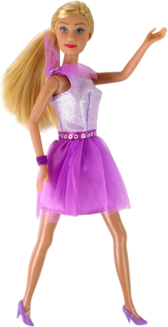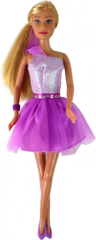 Kleed je pop Lucy in haar elegante paarse jurk met glinsterend lijfje en uitlopende rok. Bij de jurk hoort ook een paarse riem versierd met pailletten, die haar silhouet accentueert.