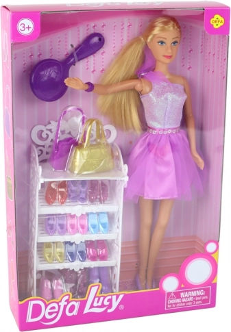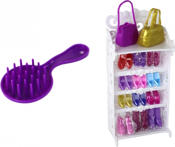 De volledige set omvat ook een witte kast voor schoenen en handtassen, een roze haarborstel voor het verzorgen van de lange blonde haren van de pop, en dit alles is verpakt in een originele doos met afmetingen 32 cm x 21 cm x 6 cm.