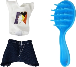 T-shirt met print, denim rokje, roze handdoek en mini flesjes voor fantasiespel met cosmetica – alles bij de hand voor kleurrijke verhalen.