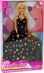 De schattige pop DEFA LUCY valt op met haar lange blonde haren, zwarte jurk met gekleurde stippen en stijlvolle accessoires. In de verpakking vind je een roze handtas, rode pumps en een armband. Ideaal voor kinderen vanaf 3 jaar, geweldig om mee te spelen of als decoratie op de kinderkamer.