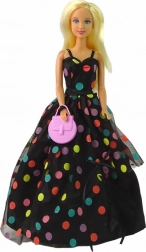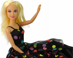 De DEFA LUCY pop brengt elegante stijl en verfijnde details die elke kleine modeliefhebber zullen betoveren. Lange, licht golvende blonde haren, een lange zwarte jurk met gekleurde stippen en bijpassende accessoires zorgen voor een harmonische en speelse look. Subtiele oogmake-up in blauw‑roze tinten en roze lippen benadrukken haar charme.