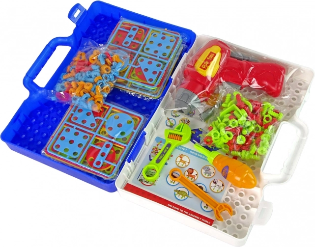 .De set bevat schroeven in verschillende kleuren (groen, rood, blauw, oranje) en ook gekleurde sleutels, een schroevendraaier en een boormachine. De puzzelonderdelen zijn er in 4 vormen en 4 kleuren, wat geweldige mogelijkheden biedt om constructies en andere meesterwerken te creëren in 3D en in klassiek vlak ontwerp. Alle onderdelen van de set zijn gemaakt van hoogwaardige kunststof.