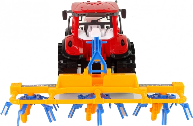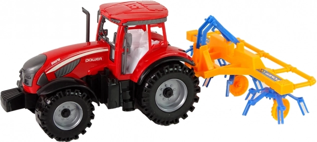 De achterste oranje-blauwe hark draait tijdens het rijden en simuleert echt werk op het veld. Stimuleert de verbeelding en rollenspel.