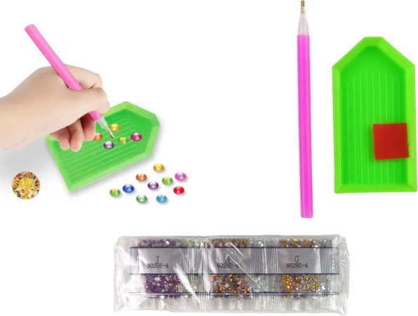In de set vind je verschillende kleuren kristallen die je kunt gebruiken om de stickers te versieren. Het oppervlak van de stickers is bedekt met een kleeflaag, met nummering voor kleurgebruik. Voeg één kristal tegelijk toe en creëer een klein kunstwerk.