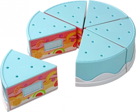 De taart bestaat uit zes driehoekige stukken die dankzij het klittenband gemakkelijk kunnen worden doorgesneden en weer samengevoegd. Realistisch speelplezier zonder scherpe randen of rommel.