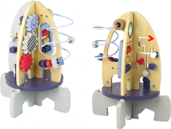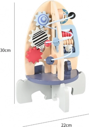 Dit multifunctionele activity center in de vorm van een raket maakt spelen tot leerzaam plezier. Kinderen schuiven gekleurde kralen door het labyrint, draaien aan de tandwielen en oefenen met de eerste getallen – dit alles bevordert oog-handcoördinatie, geduld en concentratie. Het ruimte-thema prikkelt bovendien de verbeelding en nieuwsgierigheid.