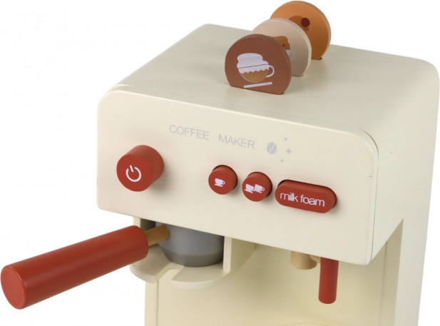 Stijlvolle houten speelgoedkoffiemachine met realistische knoppen, keuze voor een enkele of dubbele koffie en een “schakelaar” voor het opschuimen van melk. Inclusief kopje, filterdrager en 6 capsules voor creatieve baristaspelletjes. Veilig ontwerp met CE-certificering en conformiteit met EN71, ideaal voor kinderen vanaf 3 jaar.