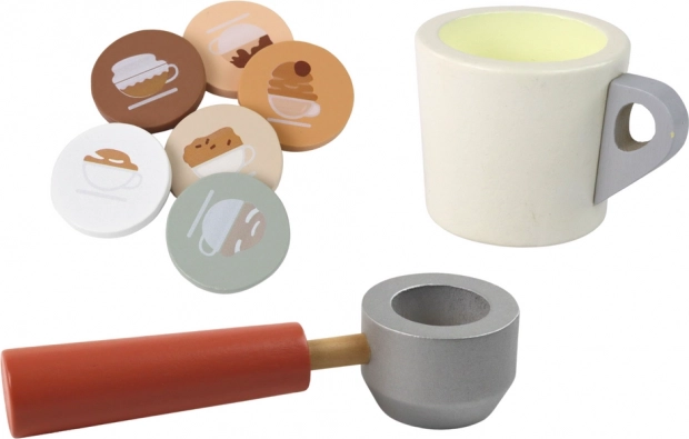 Houten speelgoedkoffiemachine met kopje en capsules