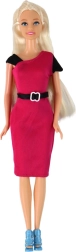 Pop van een lerares met lang blond haar en een roze elegante jurk met een zwarte riem.