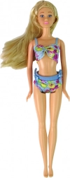 De pop met lang blond haar en een zomerse bloemenbadpak is klaar voor hete zomerdagen.