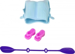 Bijgeleverd zijn een blauw reddingsvest, roze sandalen en een paarse peddel voor een realistische ervaring.