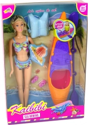 Ontdek de geweldige set die een charmante pop bevat, klaar voor waterexpedities. Haar kleurrijke zwemkleding voegt een zomerse sfeer toe en haar lange blonde haar schittert prachtig in de zon. De roze sandalen geven de hele look een extra charme.