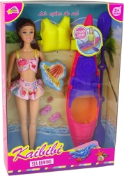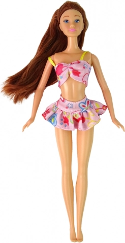 De pop in de set heeft een stijlvolle tweedelige strandoutfit en lang bruin haar, wat haar de ideale metgezel maakt voor ieder denkbeeldig spel.