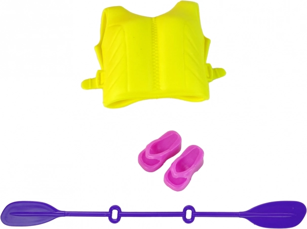 De set bevat een gele reddingsvest en een paarse peddel, waardoor kinderen kunnen genieten van een realistische waterervaring.