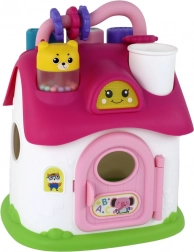 Het huisje heeft vier verschillende openingen op het dak voor sorteren op vorm en kleur en een kleurrijke deur die open kan. Op het dak bevindt zich een raam met een glimlachend gezicht dat licht geeft en geluiden maakt, wat de interactie en betrokkenheid van het kind bevordert.