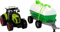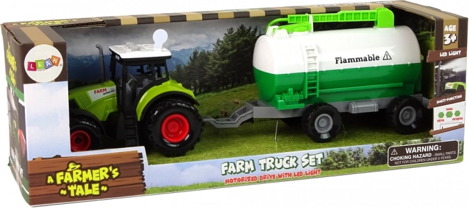 Het speelgoed is overwegend groen, een kleur die we met dit type voertuig associëren. De set bestaat uit een tractor en een cisterne, wat het spel afwisselender maakt. De tractor zelf kan rijden en karakteristieke geluiden maken. De achterwielen met handaandrijving laten het voertuig vooruit of achteruit bewegen, afhankelijk van de voorkeur. Voor de geluidsfuncties heeft de tractor 3 knoppen op het dak. Deze knoppen produceren geluiden zoals achteruitrijden, toeteren en starten. Om de geluiden te horen, moet de witte kunststof veiligheidspin worden verwijderd. De tractor heeft in de set een aanhanger met cisterne die aan de achterkant van het voertuig kan worden gekoppeld wanneer het kind ermee wil spelen. De aanhanger heeft groene delen die geopend of omhoog geklapt kunnen worden.