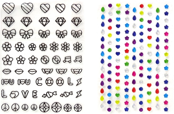 Decoratieve stickers en gekleurde “steentjes” geven je manicure glans en originaliteit. Personaliseer elke nagel naar je humeur.