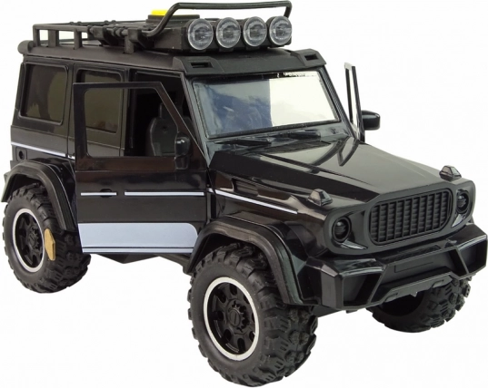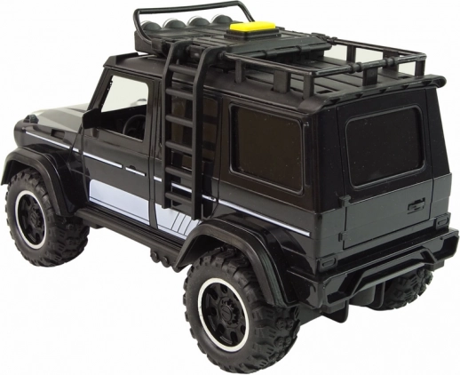 Realistische terreinwagen op schaal 1:14 van duurzaam plastic voor veel speelplezier binnen en buiten. Met te openen deuren, afneembare ladder en wrijvingsaandrijving zonder batterijen. De grote wielen kunnen oneffen terrein aan en licht- en geluidseffecten via de bovenste knop zorgen voor extra sfeer tijdens het spelen.