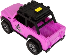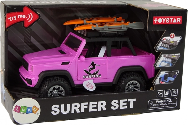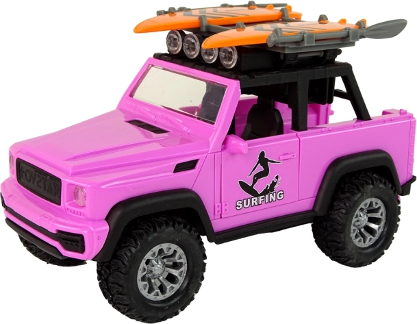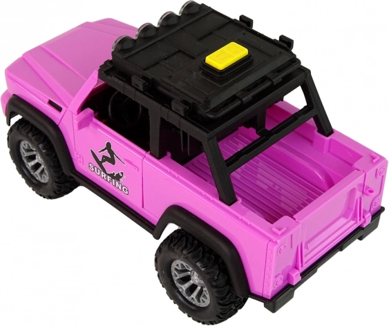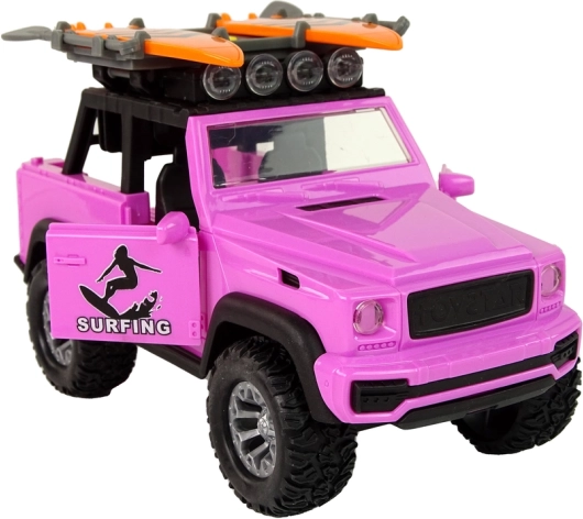 Geniet van de zomerse sfeer met deze roze offroad-wagen met surfthema. Realistische details, grote wielen en vliegwielaandrijving zorgen voor een soepele rit, terwijl lichten en geluiden elke rit tot een avontuur maken. Surfplanken en peddels op de dakdrager prikkelen de fantasie en nodigen uit tot strandverhalen.