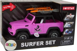 Een stijlvolle roze terreinwagen op schaal 1:14 die kleine avonturiers aanspreekt met een surf-thema. Biedt vliegwielaandrijving, licht- en geluidseffecten, openende deuren en op het dak houders voor surfplanken met peddels. De robuuste uitvoering met grote wielen is ideaal voor fantasierijk spel, zowel binnen als buiten.