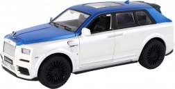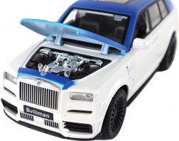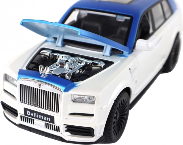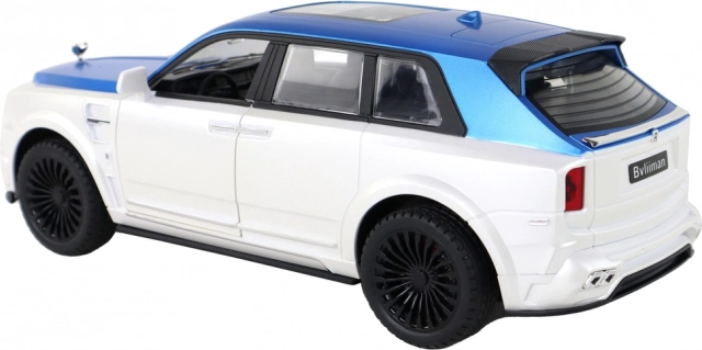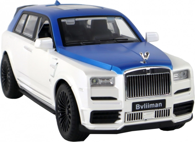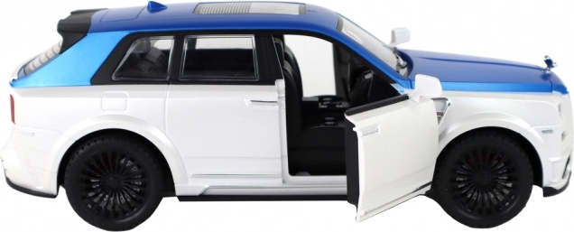 De wit-blauwe carrosserie met zilverkleurige details en functionele deuren geeft het model een authentieke look zoals een echte SUV.