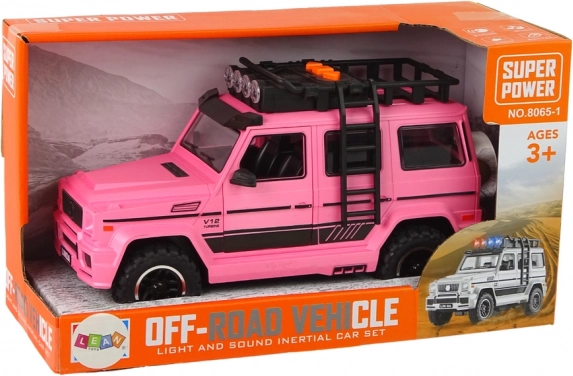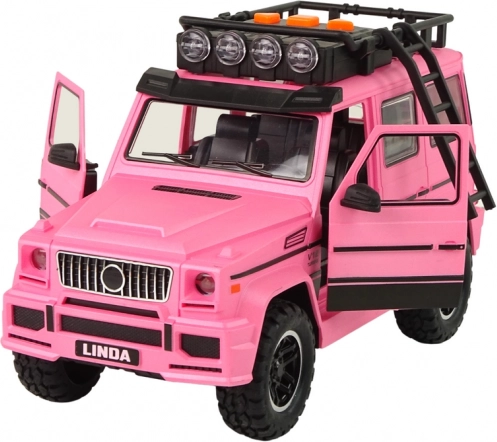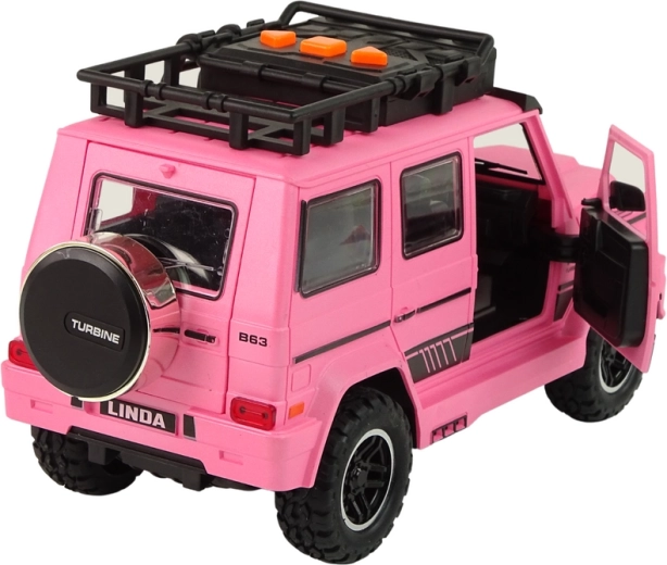 De auto heeft een schattige roze kleurstelling die hem een vriendelijke en speelse uitstraling geeft.