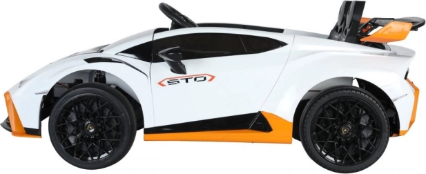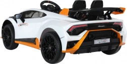 Stijlvolle elektrische kinderauto geïnspireerd op de supercar LAMBORGHINI STO biedt driftplezier, een sportief design en realistische details. De witte uitvoering met oranje accenten, verlichting, natuurgetrouwe wielen en een comfortabele zit zorgen voor een veilige en spannende rit voor jonge bestuurders.