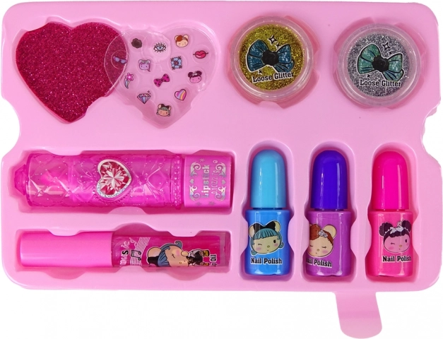 Drie nagellakken in blauw, paars en roze laten je experimenteren met verschillende tinten en trendy nagelontwerpen maken. Een roze lipstick en een roze lipgloss in een tube geven de lippen een mooie tint.