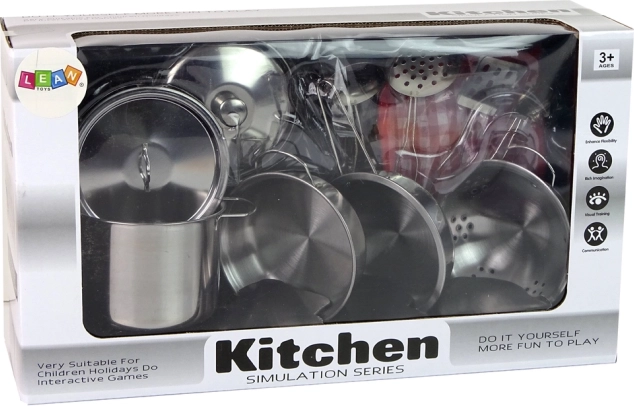 De set van metalen potten en keukengerei is bedoeld voor jonge kookliefhebbers. Sneeuwwitte en zilveren accessoires zorgen voor een realistische uitstraling en ondersteunen de ontwikkeling van de verbeelding en culinaire vaardigheden van kinderen.