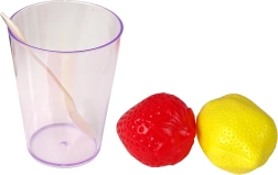 Inclusief kopjes, schoteltjes, een glaasje, een lepeltje en schattig fruit – aardbei en citroen – voor stijlvol serveren.