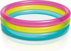 Het opblaasbare kinderzwembadje INTEX Rainbow is kleurrijk en praktisch voor zomerdagen. Dankzij de drie transparante ringen is het stabiel en comfortabel, terwijl de compacte afmetingen van 86 × 25 cm op de meeste tuinen, terrassen en balkons passen. De capaciteit van 68 liter bij de aanbevolen waterhoogte van 17 cm zorgt voor een veilige, ondiepe waterpartij voor peuters.