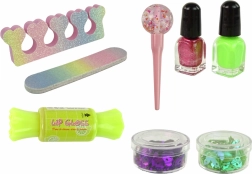 Deze prachtige cosmeticaset bevat veel aantrekkelijke elementen die elke jonge stijlenthousiasteling zullen verrukken. Een teenspreider helpt bij het lakken van de nagels, terwijl twee lipglosses voor charme en glans zorgen. Een vijl en drie nagellakken, waarvan twee met glitters en één in een heldere kleur, maken creatieve nageldecoratie met verschillende patronen mogelijk.