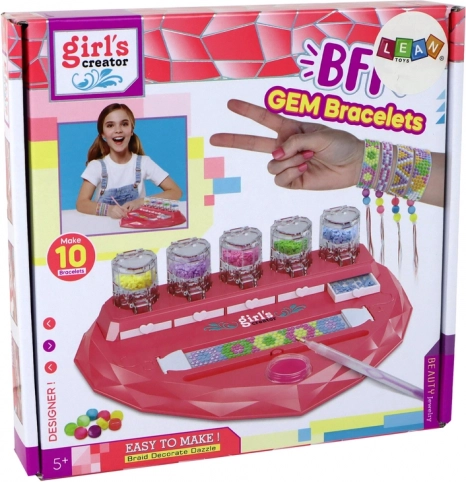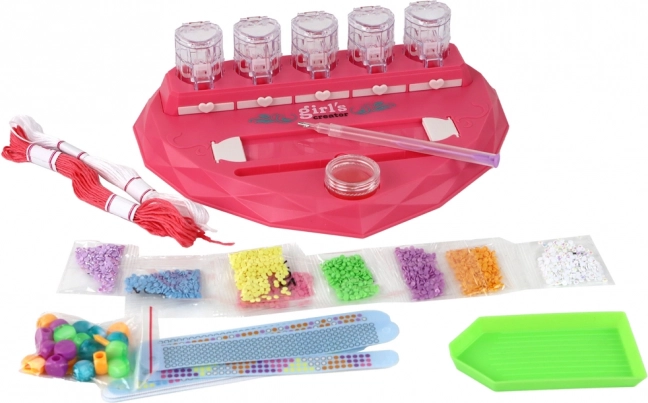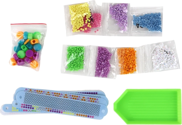 Maak je eigen glinsterende armbanden met deze creatieve set voor kinderen vanaf 5 jaar. Het hartvormige station met organizer, kralen, “diamanten” steentjes en koordjes laat je tot 10 originele armbanden ontwerpen. Eenvoudig uitkloppen en plakken van steentjes, ontwikkeling van fijne motoriek en creativiteit en overzichtelijke opberging van materialen maken elke kleine ontwerpster blij.