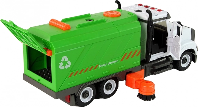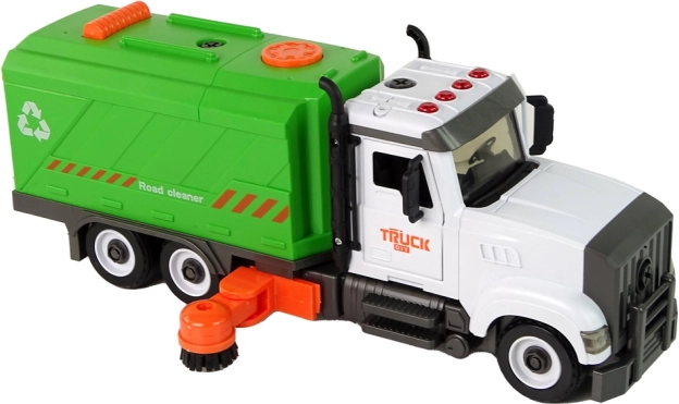 Deze gedetailleerde veegwagen in groen-witte uitvoering brengt kinderen een realistisch straatreinigingsspel. Openende voor- en achterdeuren, grote stabiele wielen en oranje zijborstels zorgen voor authenticiteit. Dankzij de wrijvingsaandrijving hoef je het voertuig alleen maar naar achteren te trekken en los te laten – het rijdt vanzelf weg.