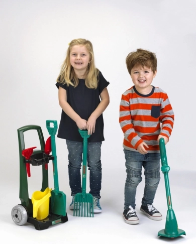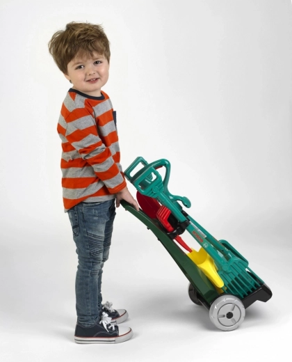 Onverwoestbare set voor kleine outdoor- en tuinliefhebbers. De tuinkar is gemaakt van hoogwaardig plastic, heeft een donkergroene kleur, twee grote wendbare wielen en is bovendien uitgerust met een zwarte mand voor klein tuingereedschap en een zwarte stabiele basis waarop je het tuingereedschap kunt vervoeren met behulp van een comfortabel handvat. De tuinkar is een replica van het populaire ontwerp van het merk Bosch. Tot de accessoires van de kar behoren een robuuste groene schop en hark van hoogwaardige kunststof, daarnaast een gele gieter, een rood tuinschepje en een zandhark. Vooral populair is de groene grastrimmer met een geweldig rammelend geluid wanneer het wieltje draait. Meedoen in de tuin is voor kinderen niet alleen leuk, maar traint ook de motoriek, het ruimtelijk inzicht en zorgt voor gezonde beweging in de frisse lucht.